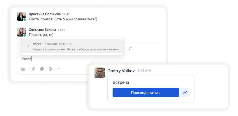 Быстрая команда /meet создает виджет встречи прямо в чате, ссылку на нее можно отправить любому пользователю мессенджера